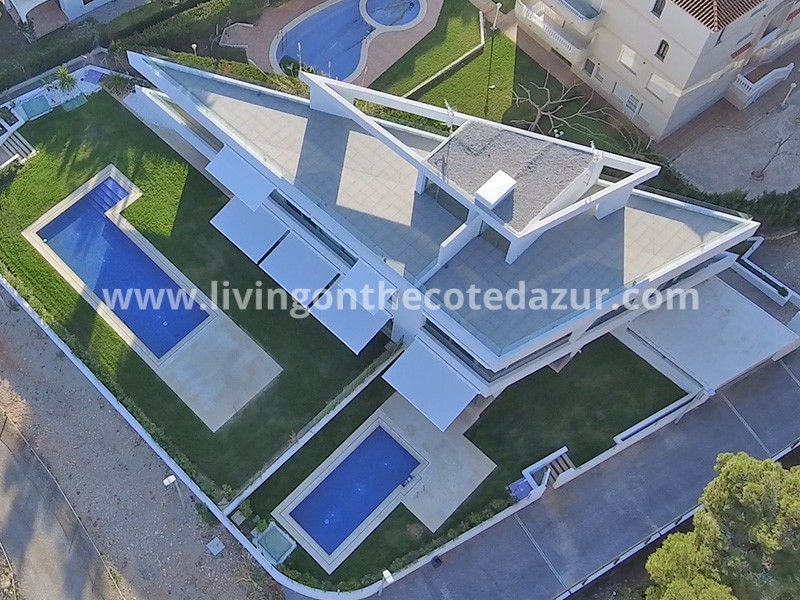 Deze villa maakt deel uit van een grote driehoekige vorm die eruitziet als een groot schip. De totale constructie bestaat uit twee villa’s, met allebei hun eigen privacy, tuin en zwembad. Er komen geen auto’s langs, de weg is alleen voor fietsen en mensen die van de zee, het strand en de natuur houden. Het natuurpark Serra d’Irta ligt op slechts tien minuten afstand en voor een directe verbinding vind je de nieuwe luchthaven Castellón-Costa Azahar op 14 kilometer. In de garage kun je je auto, jetski of fietsen parkeren.