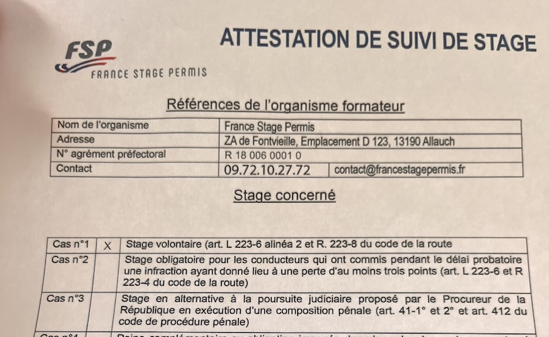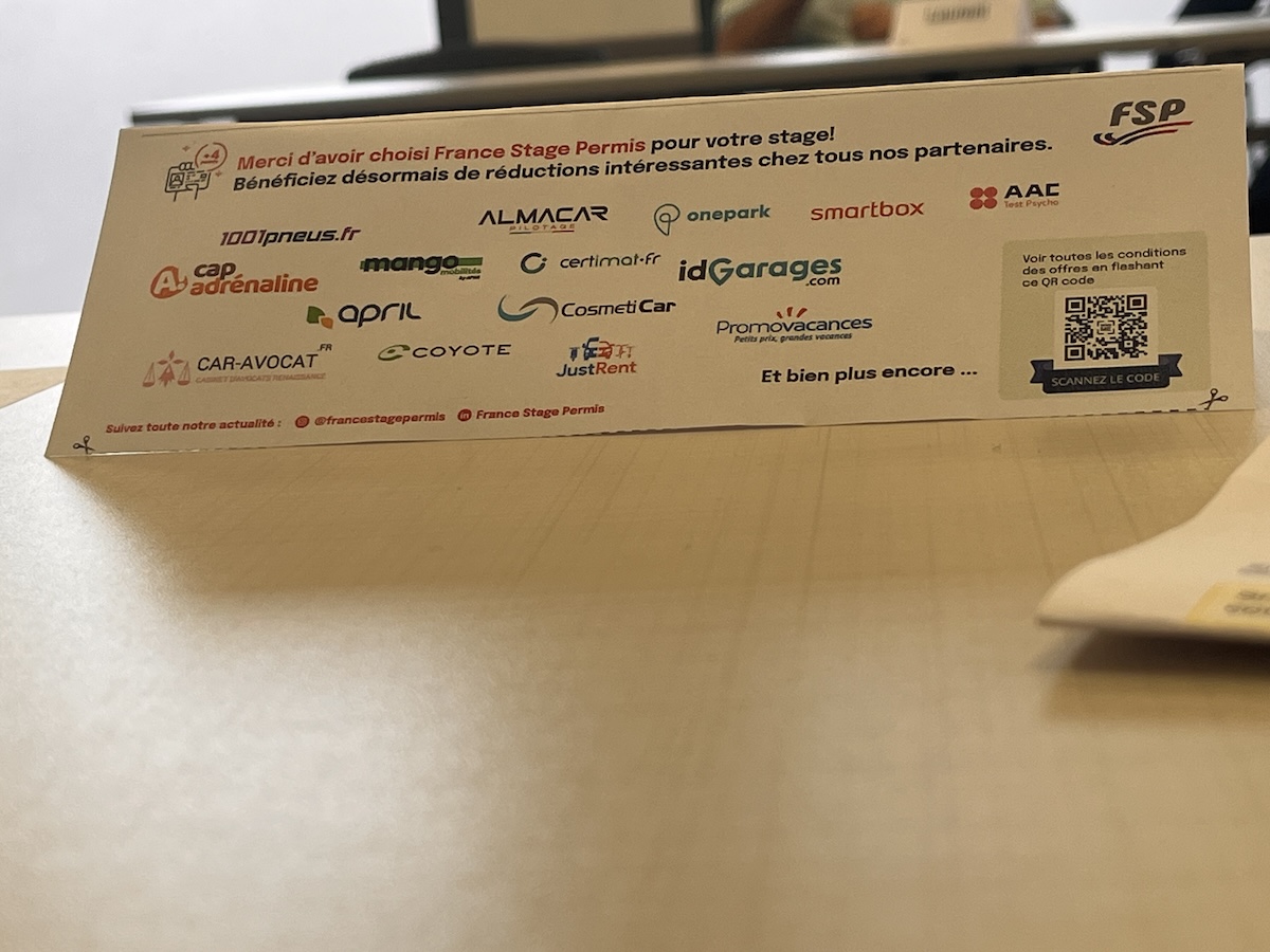 Suddenly, I only had 5 points left and decided to do an ‘internship de permit’. Anyone who attends a re-education school for two days earns four points again. You can only do this once a year, so quite a few people come for the 2nd or third time. I don’t have particularly good memories of school, but necessity makes law, so last Monday at 8:00 am, I showed up at ‘France Stage Permis’ in Nice. A driving examiner and a psychologist kept us busy for two days, improving our awareness and road use.