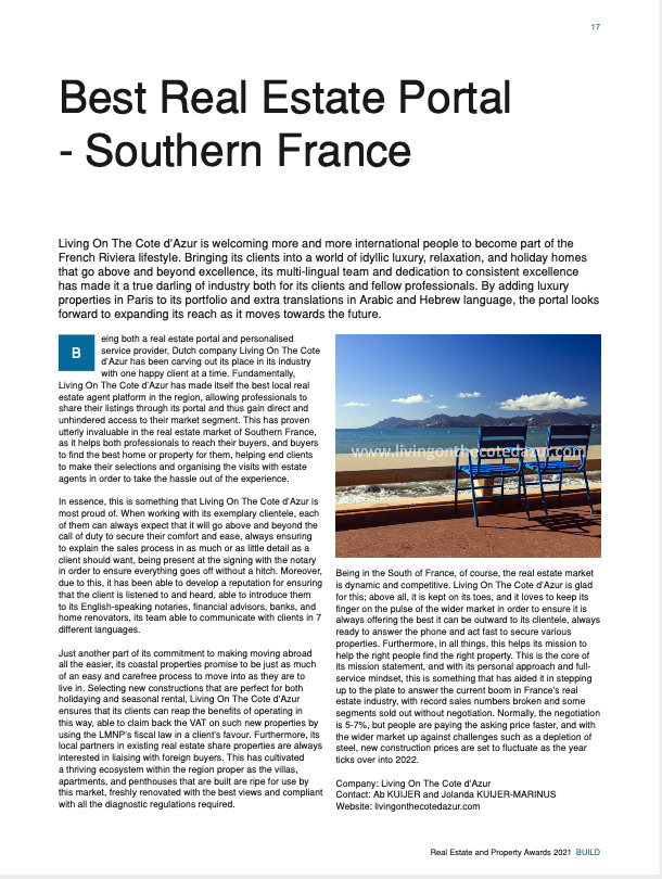 We are proud to share the news that BUILD magazine has awarded us the title of Best Real Estate portal for the South of France. The jury specifically examined which companies, with innovation and creativity, survived the Corona crisis and lockdowns and achieved growth as a result.